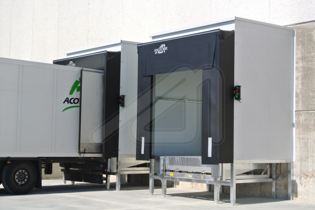 El abrigo espumado está diseñado para adaptarse a la geometría del vehículo mediante cojines laterales y superiores de espuma, que sellan el perímetro del vano de carga cuando el camión se apoya sobre él.